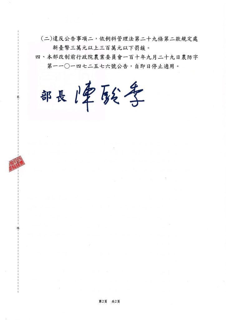 (二)違反公告事項二,依飼料管理法第二十九條第二款規定處新臺幣三萬元以上三百萬元以下罰鍰。